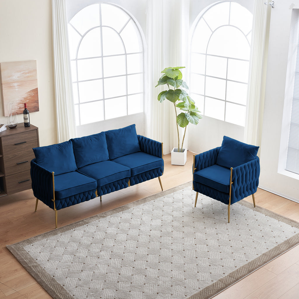 Handmade Woven Velvet Back and Sides Sofa Set, One Accent Chair And One 3 Seater Sofa, Gold Frame and Gold Legs , Modern Living Room Sofa Sets for Living Room , Blue Velvet