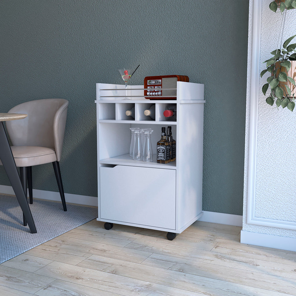 Featuring multiple shelves, compartments, and four built-in bottle holders, this cart provides ample space to neatly organize bottles, glassware, and all your bar essentials