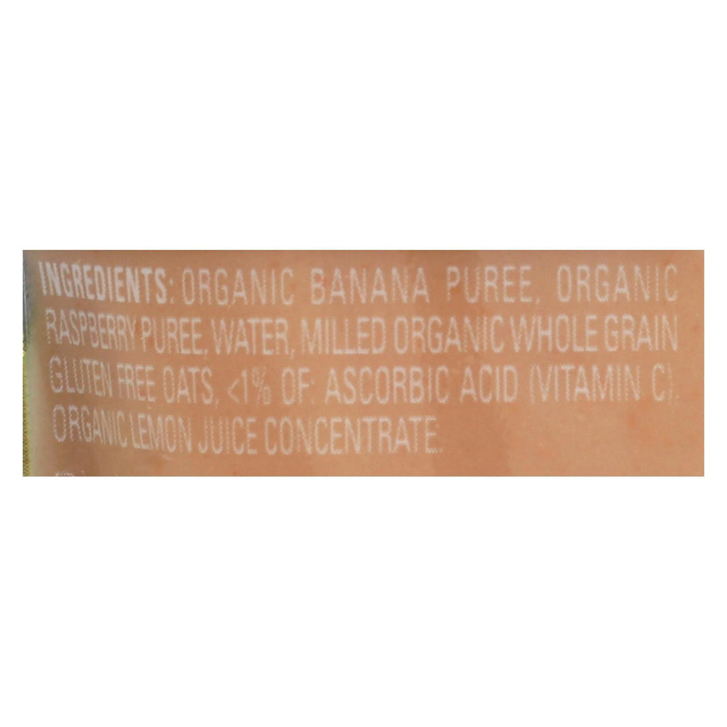 ingredients : organic banana puree;organic raspberry puree;water;milled organic whole grain gluten free oats;<1% of: ascorbic acid;vitamin c;organic lemon juice concentrate
