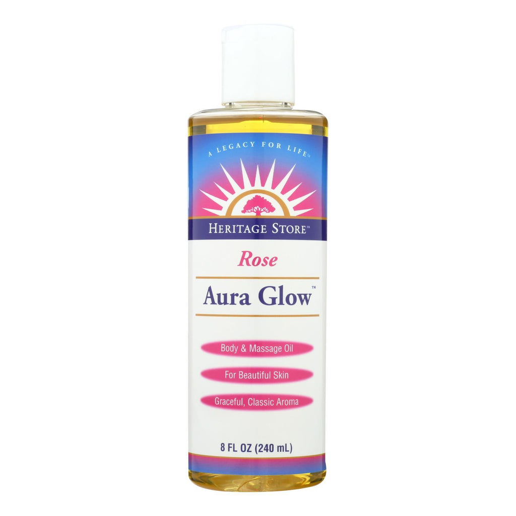 Heritage store rose aura glow body & massage oil is made from a blend of various oils, including lanolin, peanut and olive oil, to soothe and nourish the skin. Massage our oil directly onto the skin after a bath or shower, or use it after shaving to restore moisture. Each bottle of massage oil contains 8 fl.oz.