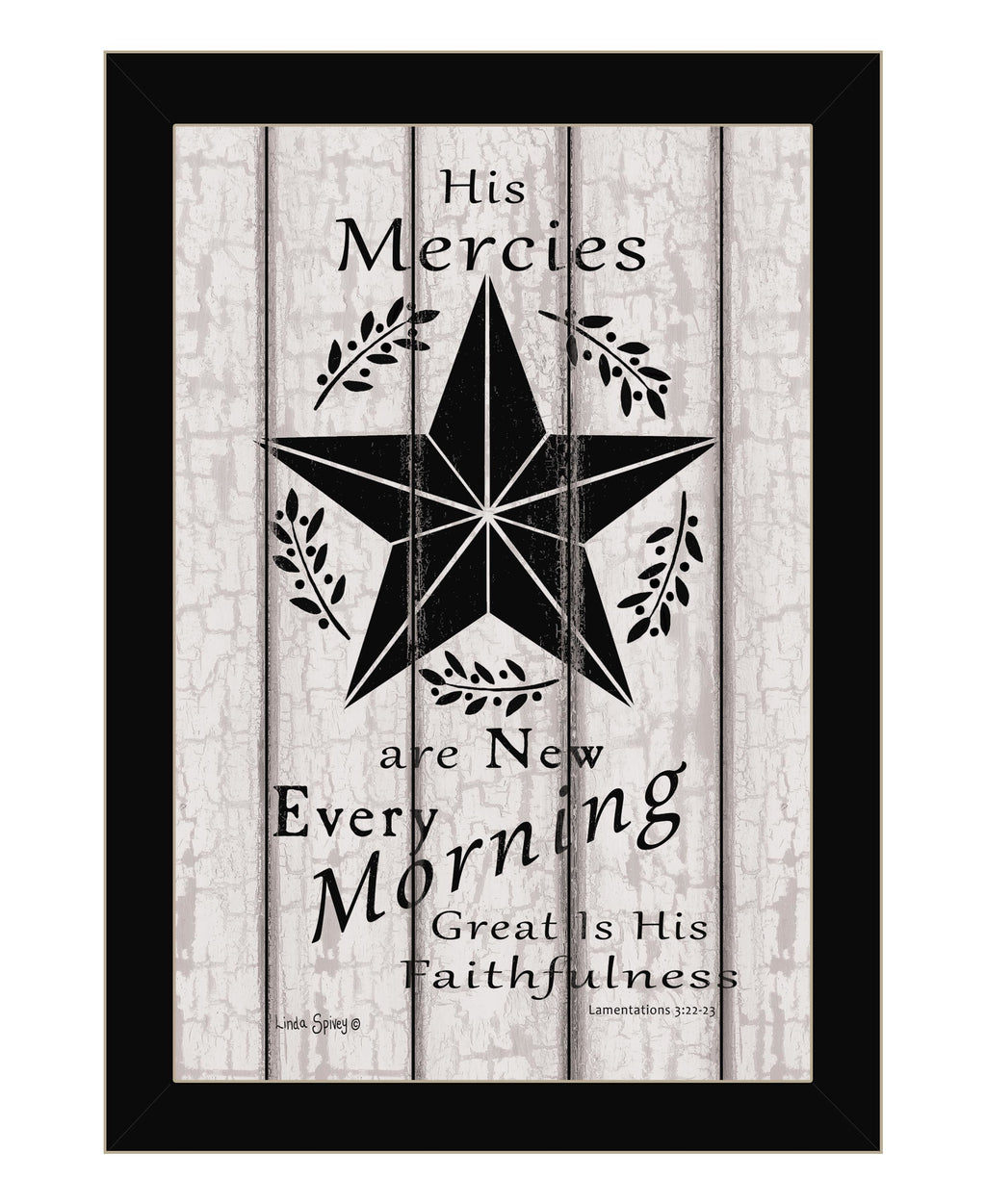 "His Mercies are New Every Morning" is by Artisan Linda Spivey. This 14"X20" decorative black framed wall art. The image features a chipped shiplap style background with a vintage barn star in the middle surrounded by decorative leaves. The script arranged around the star reads "His mercies are new every morning great is his faithfulness". This image would be perfect for any location. Our products are proudly made by skilled American workers. The surface of our framed art is textured with a fade resistant coating, so no glass is necessary. A vegetable-based glue is used in the production of our products, and our frames are crafted from 100% recycled material. In keeping with our environmentally friendly approach towards manufacturing. Arrives ready to hang.•Print has fade resistant surface texture, no glass is necessary•Woman Owned Business (WBE)•Arrives ready to hang, no additional hardware needed on item•individually hand crafted by skilled American workers•Cleaning Instructions: Clean with Soft Dry Cloth Only•Made in U.S.A.•Artwork by American Artist