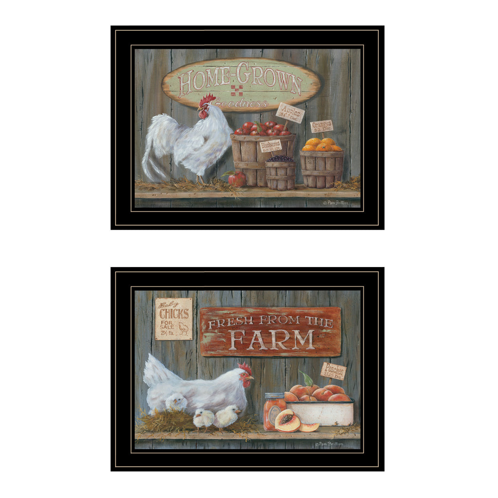 VBR697-704G "Home Grown" by Artisan Pam Britton. This decorative black framed 2-pc(19x15) Collection of farm items; white rock chickens, peaches, baskets of apples with a sign saying "Home Grown" along with another framed print with sign saying "Fresh from the farm"; hen with baby chicks, canned peaches and a sign saying "baby chicks for sale". This framed art is totally American made. The surface of the art is coated with a fade resistant texture which gives it a canvas-like appearance. No glass is necessary. Arrives ready to hang. •Women Owned (WBE)•Textured Artwork with a 'rolled on' acid free acrylic coating to create a canvas painting effect. No glass is necessary.•UV protectant coating protects artwork from fading.•Molding adds natural beauty to the framed art. Frame is keyholed for ease of hanging.•Frame is keyholed for ease of hanging.