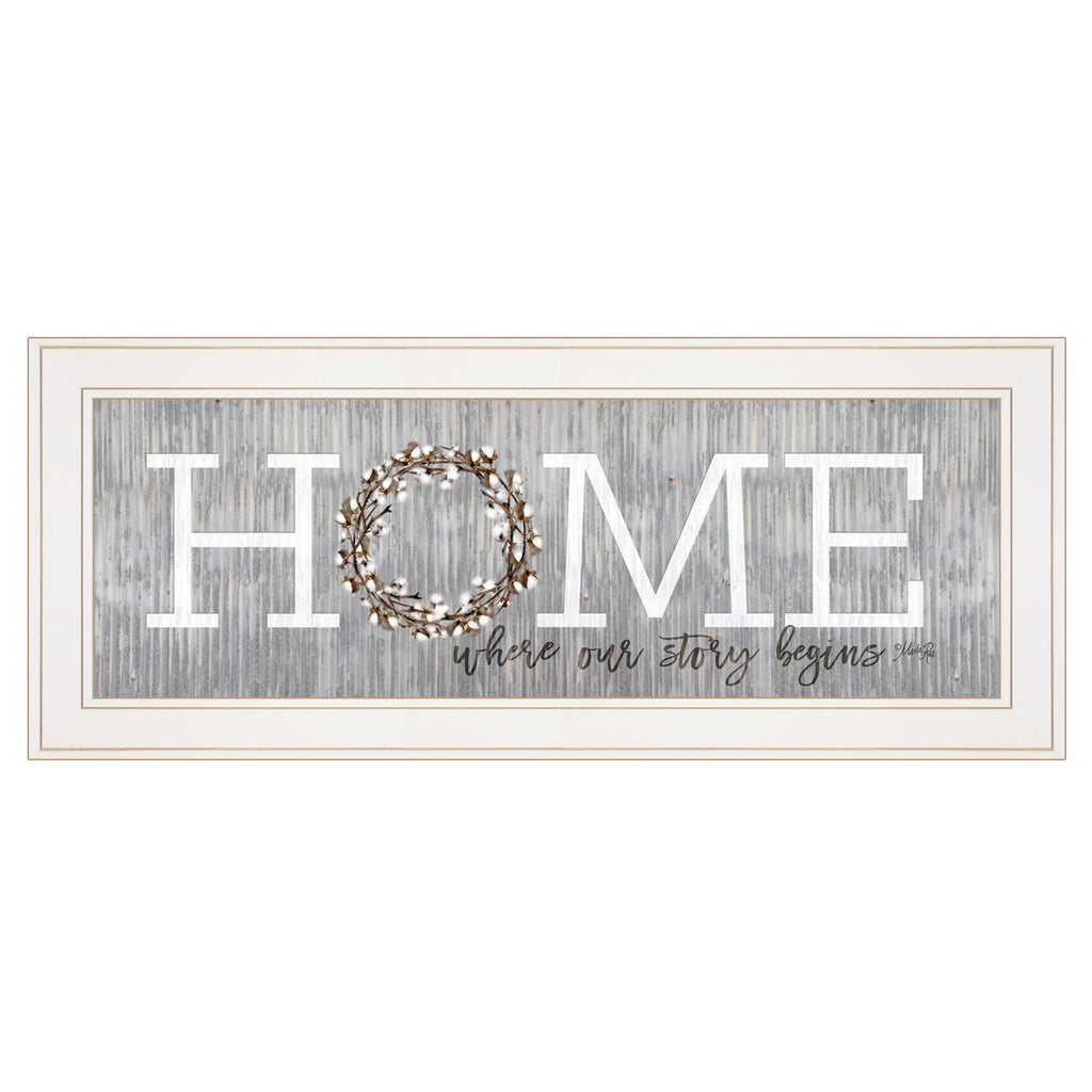 "Home-Where Our Story Begins" by artist Marla Rae. This decorative white framed print of 27x11 size of printed on paper to look like metal with word "Home". Framed print has a UV coating (glass is not needed) and arrives ready to hang.•TEXTURED ARTWORK with a 'rolled on' acid-free acrylic coating to create a canvas painting effect.•UV PROTECTANT COATING protects artwork from fading. No glass is necessary.• MOULDING adds natural beauty to the framed art. Frame is keyholed for the easy hanging.•THIS FINE HOME DECOR piece made in the USA by Woman Owned Business (WBE) is a perfect gift for a friend or relative.