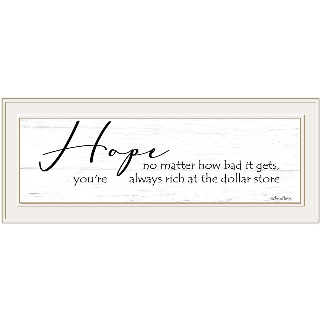"Hope" by artist Lori Deiter. This decorative frame white print 23"x11" of calligraphy for the family. Hope no matter how bad it gets, you're always rich at the dollar store. Prints are UV coated (glass is not needed) and arrives ready to hang.•TEXTURED ARTWORK with a 'rolled on' acid-free acrylic coating to create a canvas painting effect.•UV PROTECTANT COATING protects artwork from fading. No glass is necessary.• MOULDING adds natural beauty to the framed art. Frame is keyholed for the easy hanging.•THIS FINE HOME DECOR piece made in the USA by Woman Owned Business (WBE) is a perfect gift for a friend or relative.