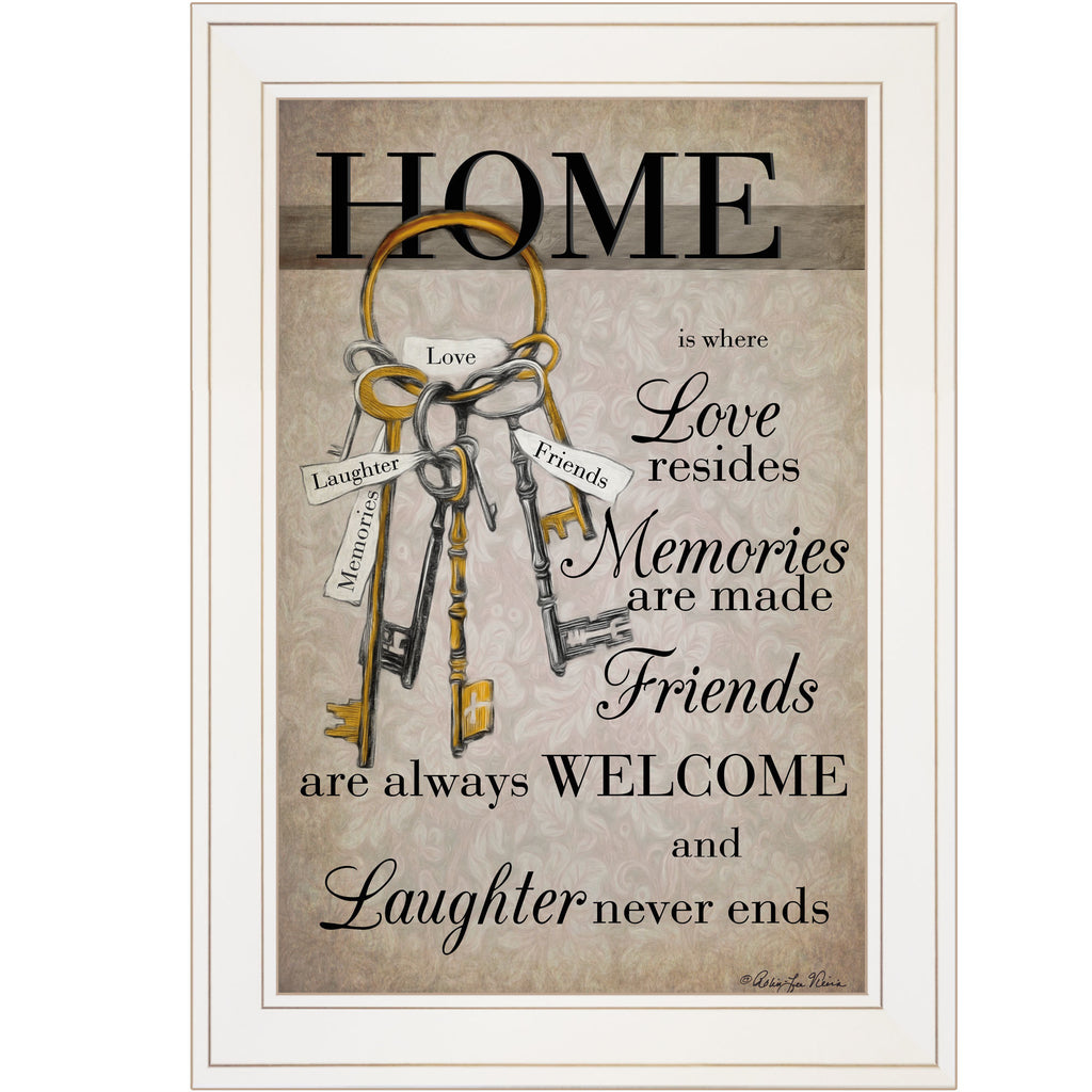 RLV609-226G House Keys by artisan Robin-Lee Vieira. This decorative white framed print(15x21) of your home and the love that resides, the memories that are made and the friends that arrive. Prints are textured -no need for glass. •TEXTURED ARTWORK with a 'rolled on' acid-free acrylic coating to create a canvas painting effect.•UV PROTECTANT COATING protects artwork from fading. No glass is necessary.• MOULDING adds natural beauty to the framed art. Frame is keyholed for the easy hanging.•THIS FINE HOME DECOR piece made in the USA by Woman Owned Business (WBE) is a perfect gift for a friend or relative.