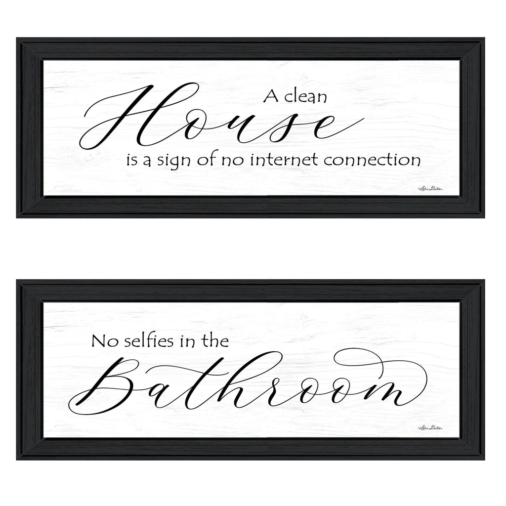 "Household Humor" by Lori Deiter. Decorative black framed prints 2-23"x11" of family humor: No Selfies in the Bathroom & a clean house is the sign of no internet! Prints are UV coated (glass is not needed) and arrives ready to hang.•TEXTURED ARTWORK with a 'rolled on' acid-free acrylic coating to create a canvas painting effect.•UV PROTECTANT COATING protects artwork from fading. No glass is necessary.• MOULDING adds natural beauty to the framed art. Frame is keyholed for the easy hanging.•THIS FINE HOME DECOR piece made in the USA by Woman Owned Business (WBE) is a perfect gift for a friend or relative.