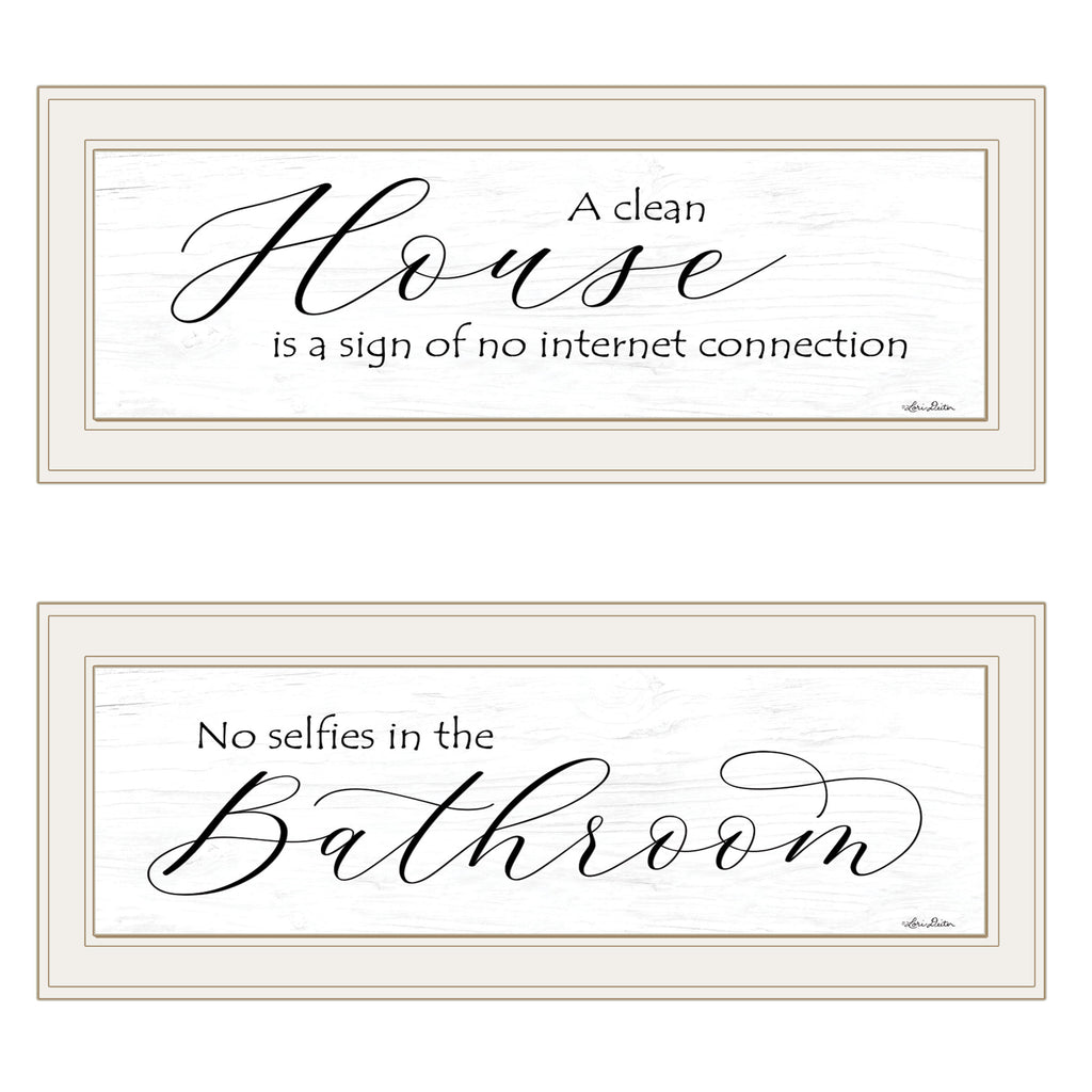 "Household Humor" by Lori Deiter. Decorative white framed prints 2-23"x11" of family humor: No Selfies in the Bathroom & a clean house is the sign of no internet! Prints are UV coated (glass is not needed) and arrives ready to hang.•TEXTURED ARTWORK with a 'rolled on' acid-free acrylic coating to create a canvas painting effect.•UV PROTECTANT COATING protects artwork from fading. No glass is necessary.• MOULDING adds natural beauty to the framed art. Frame is keyholed for the easy hanging.•THIS FINE HOME DECOR piece made in the USA by Woman Owned Business (WBE) is a perfect gift for a friend or relative.