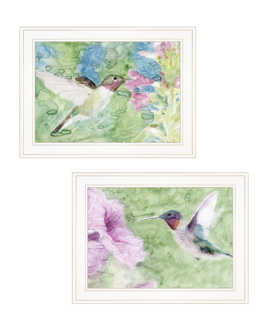 "Humming Bird 1 & 2" Vignette is by ArtisanStellar Design Studio. This 2-19"X15" decorative white framed wall art. This image features a watercolor style of a Hummingbird in midflight taking a quick drink from a flower. This image would look perfect in any location that needed a little added color. Our products are proudly made by skilled American workers. The surface of our framed art is textured with a fade resistant coating, so no glass is necessary. A vegetable-based glue is used in the production of our products, and our frames are crafted from 100% recycled material. In keeping with our environmentally friendly approach towards manufacturing. Arrives ready to hang.•Print has fade resistant surface texture, no glass is necessary•Woman Owned Business (WBE)•Arrives ready to hang, no additional hardware needed on item•individually hand crafted by skilled American workers•Cleaning Instructions: Clean with Soft Dry Cloth Only•Made in U.S.A.•Artwork by American Artist