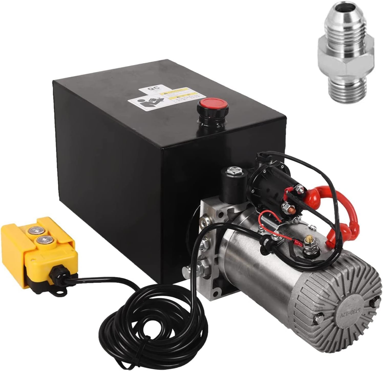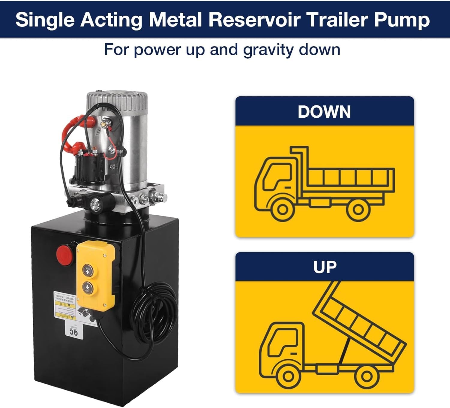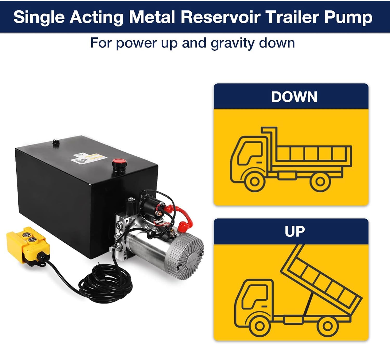 This 13 Quart Metal Reservoir & Single Acting hydraulic pump is designed with a 12V DC motor that can provide strong power for hydraulic systems like dump trailers, forklifts, car lifting, lifting platforms, etc.