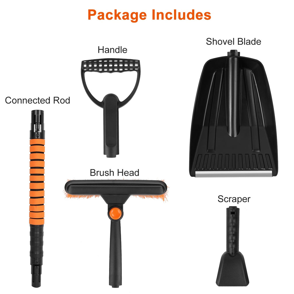 *5 in 1 Multifunctional Kit*:Include brush,scraper and shovel which are connected by stretchable rod,fit for your various needs. Snow brush quickly remove the snow from the car roof,windshield and hood;fine scraper can wipe water but does not hurt the paint;shovel effectively dig out your car from snowfield;dentate side can shovel ice easily;fillet scraper can shave frost but not hurt the glass. A practical snow remover kits for car you must have in this winter!