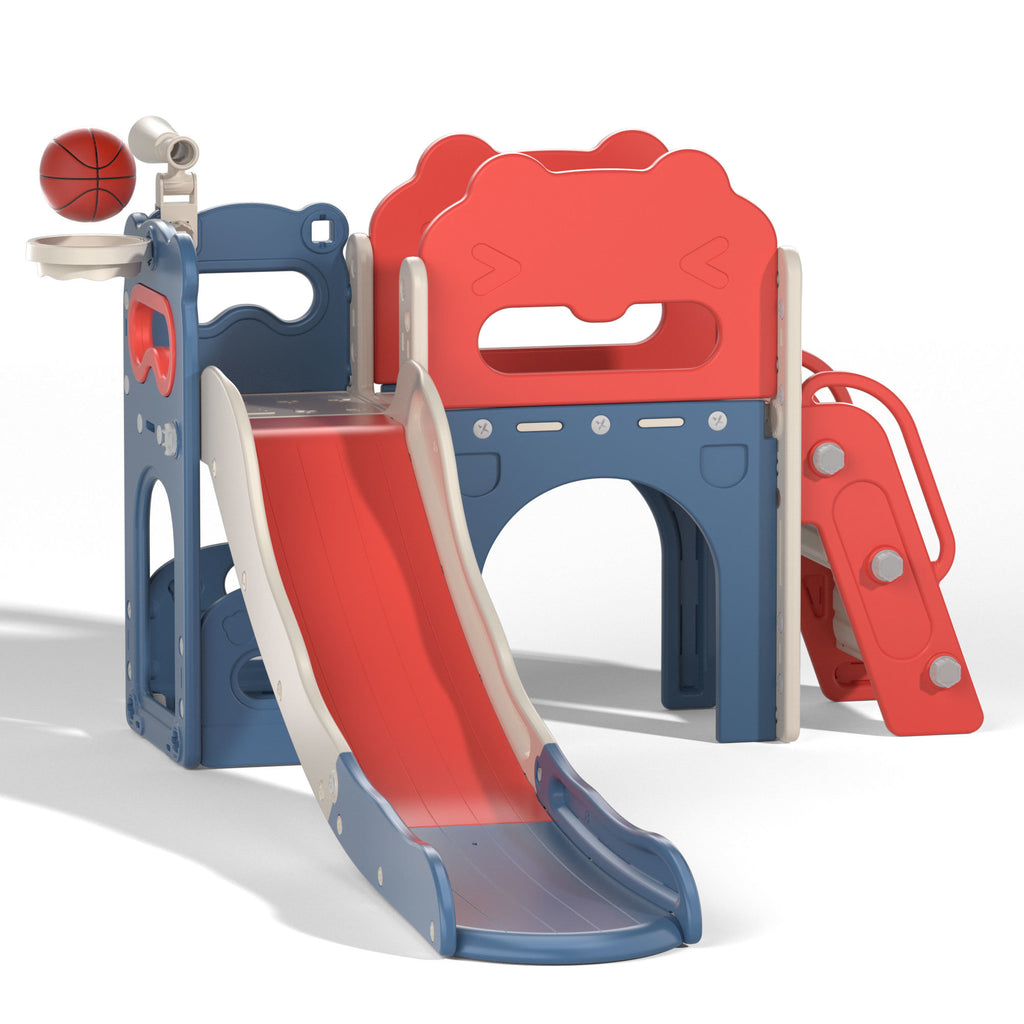[Toddler's Activity Center]: Including an extra-long slide, a climber with handrails, an aisle, a tunnel for crawling, a basketball hoop and ball, a telescope, and storage, this toddler castle climber gives kids endless fun.