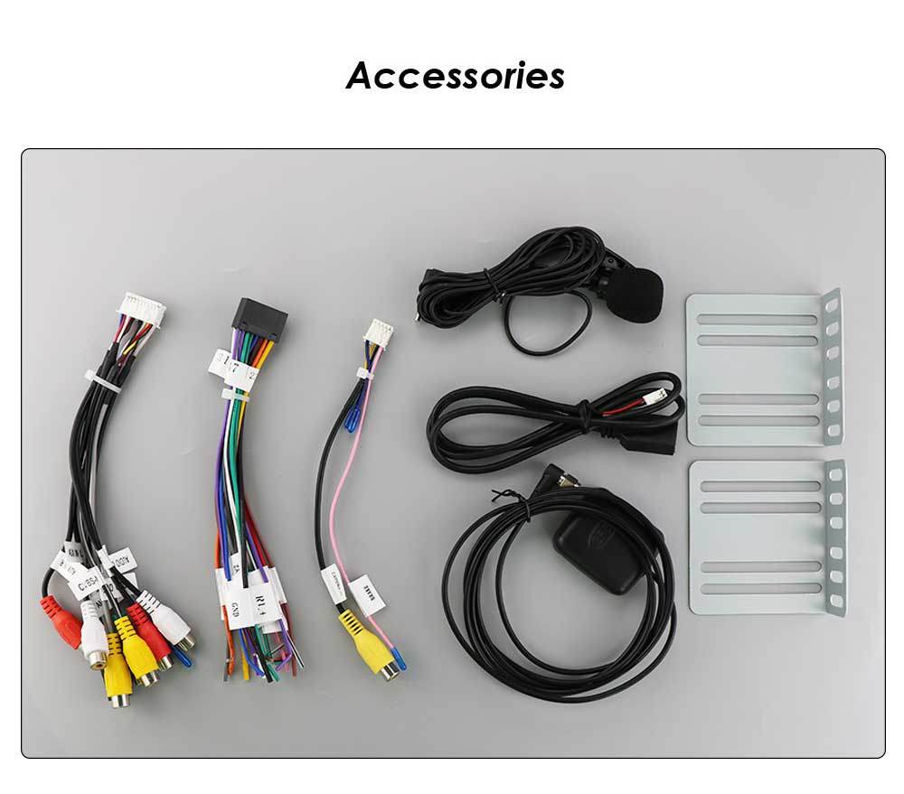 - 1*Power Cable - 1*Wifi Antenna (attached to the back panel) - 1*Rear Camera input RCA Cable - 2*Install Fittings |