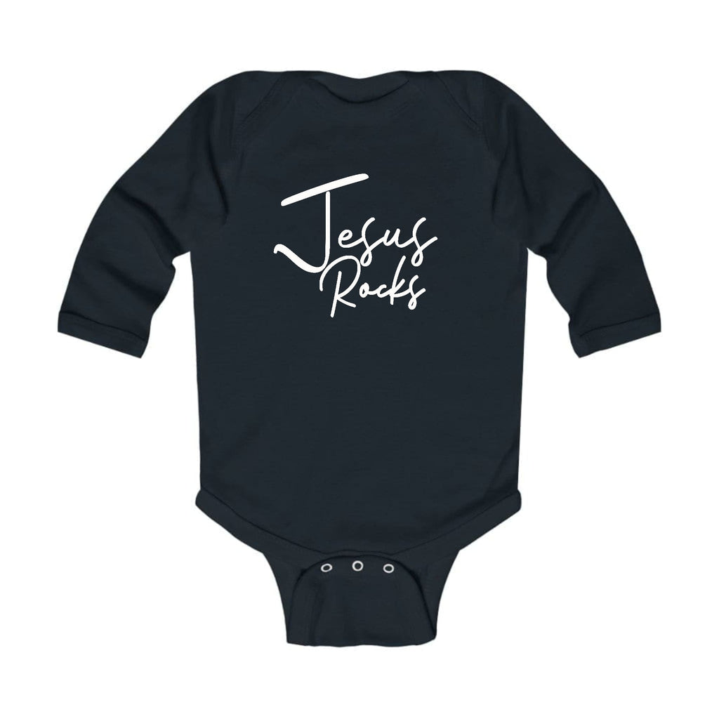 Infant Long Sleeve Graphic T-Shirt Jesus Rocks - Christian Inspiration Affirmation . Classic comfort meets color with these soft lap shoulder bodysuits for babies. Whether layered or alone, this bodysuit is soft yet durable enough to stand up to your infant's playtime demands. This one-piece bodysuit features lap shoulders to make it easier for the many times a day that parents have to change baby's outfit.