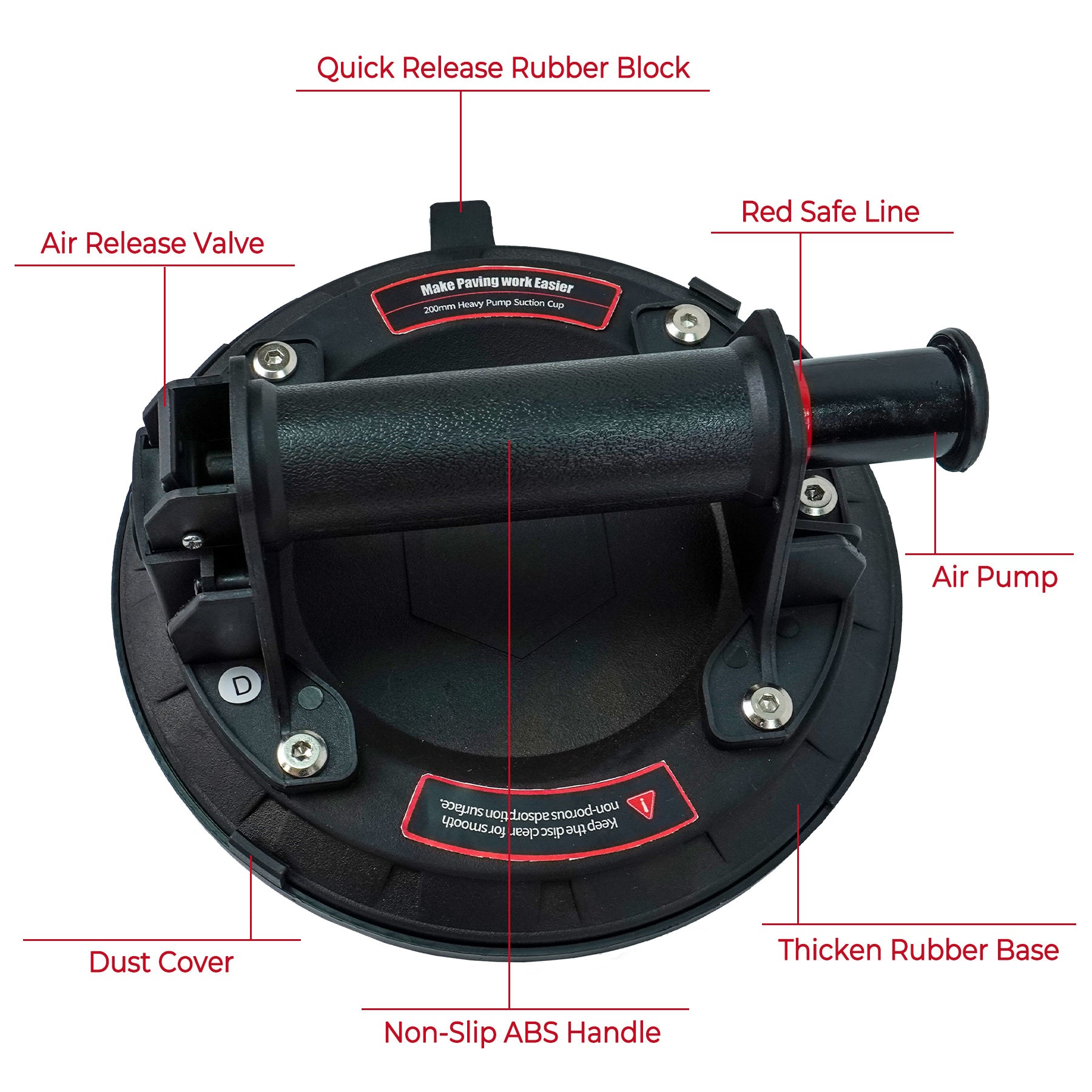 [Three-Step Quick Start]Three step use: Step1 CLEAN vacuum pads and the load surface; Step2 PUMP the plunger a few strokes, when the red-line disappear ready for lifting; Step 3 press the RELEASE button, when the red-line shows up, remove the pump.