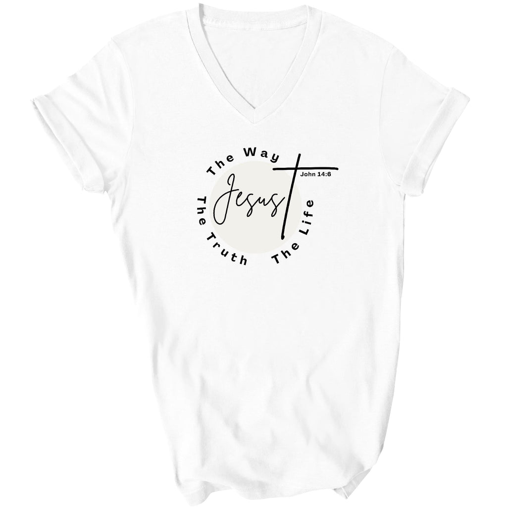 Jesus The Way The Truth The Life - Christian Affirmation - Black Graphic V-Neck T-Shirt. This graphic tee t-shirt is both durable and comfortable. Made with preshrunk cotton, which means the shirt retains its softness and size after being washed.