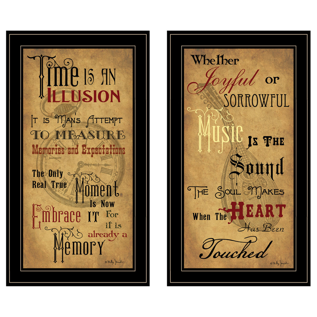 V621-704G "Joyful" by artisan Billy Jacobs. This 2- piece(2-15x27) black framed vignette of his print called memories and the Sound of the Soul. State Time is an Illusion; man's attempt to measure Memories and Expectations; along with a reminder that Music is the sound of the soul. The surface of the print is textured with a fade resistant coating so no glass is necessary. Arrives ready to hang. Made in the USA by skilled American workers. •Print has fade resistant surface texture, no glass is necessary•Woman Owned Busines (WBE)•Arrives ready to hang, no additional hardware needed on item•individually hand crafted by skilled American workers•Decorative grouping in matching frames