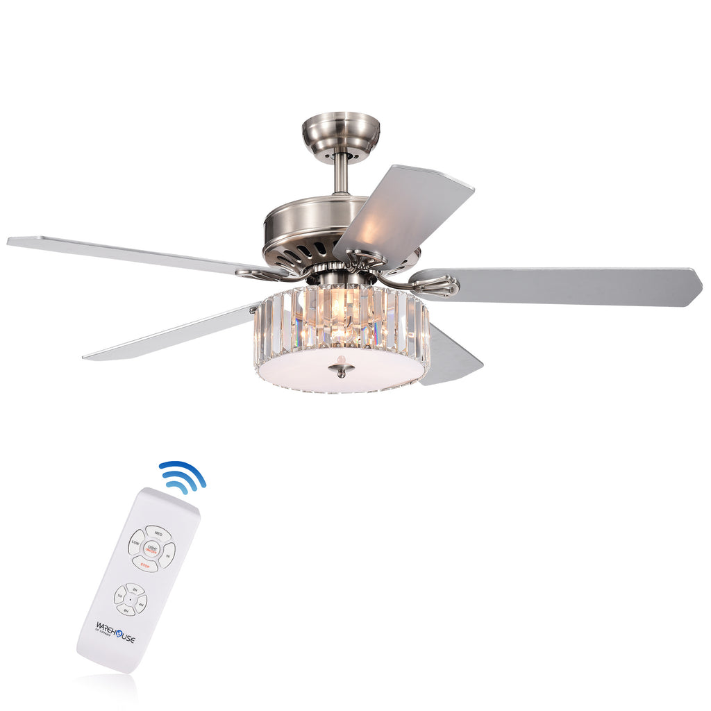 Give your living room a touch of glam with this stunning ceiling fan. The bright three-bulb light has a sparkling crystal shade for an upscale look, and the sleek nickel finish adds a contemporary touch. With five wood blades and a sturdy metal frame, this fan is as durable as it is stylish.