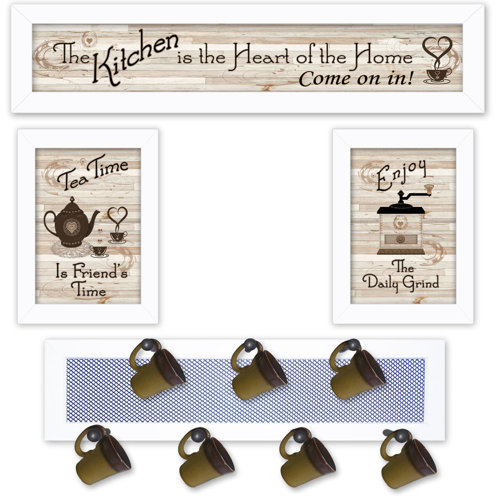 V433-MPH-712W Kitchen Collection IV, a 4 piece grouping by the designers at Trendy decor 4U, in matching white frames which can be hung in many attractive combinations: Mug Rack (26 x 7) with 7 pegs (mugs not included); Framed Prints: Tea Time (10 x 14) & The Daily Grind (10 x 14), and "Kitchen is the Heart of the Home" (32 x 7), which works great over doorways and windows. The mug rack can hang horizontal or vertical and can hang 7 mugs, or be inventive and display towels, key rings or double strung candles. The surface of the prints is textured with a fade resistant coating so no glass is necessary. Arrives ready to hang. Made in the USA by skilled American workers. •TEXTURED ARTWORK with a 'rolled on' acid-free acrylic coating to create a canvas painting effect.•UV PROTECTANT COATING protects artwork from fading. No glass is necessary.• MOULDING adds natural beauty to the framed art. Frame is keyholed for the easy hanging.•THIS FINE HOME DECOR piece made in the USA by Woman Owned Business (WBE) is a perfect gift for a friend or relative.