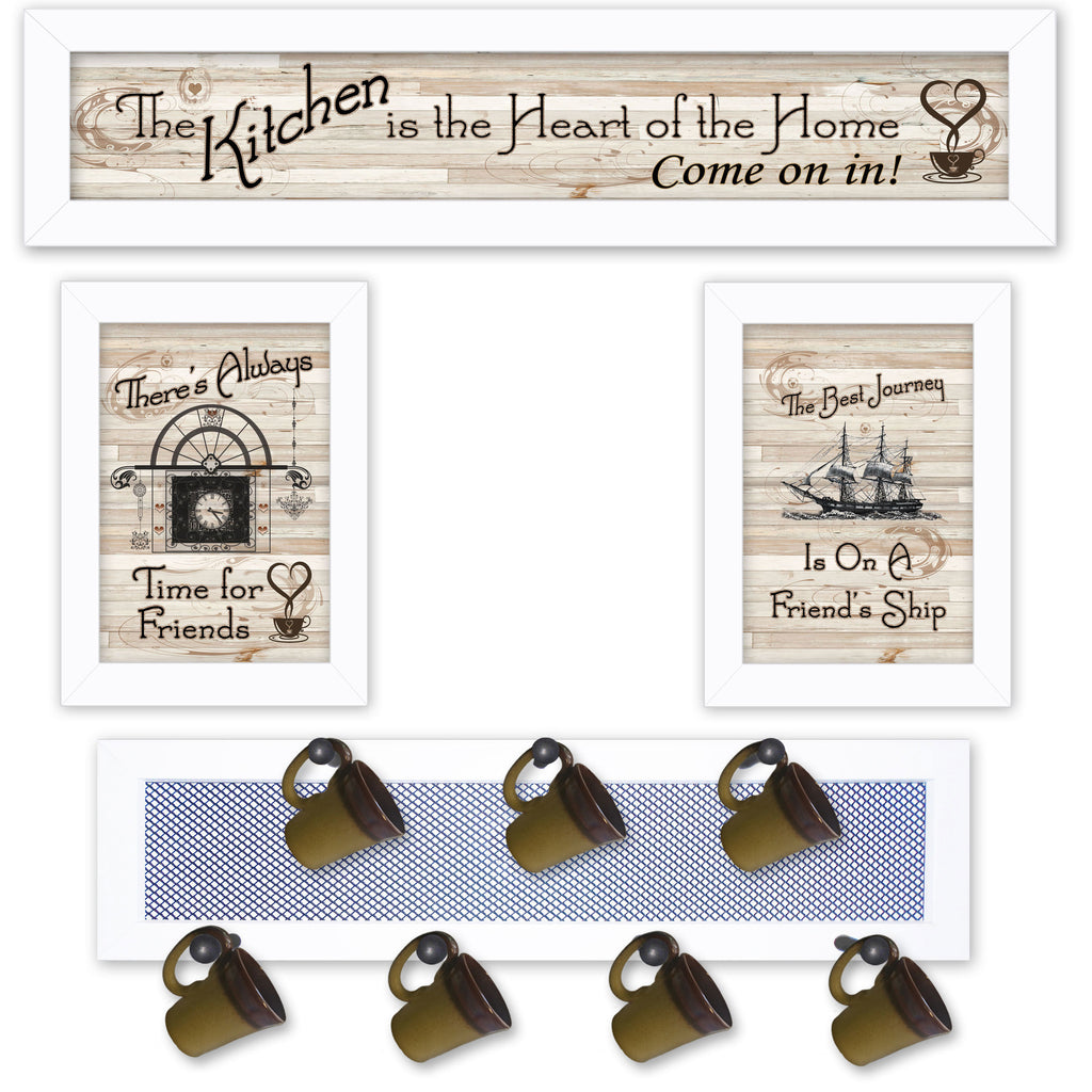 V435-MPH-712W Kitchen Collection VI, a 4 piece grouping by the designers at Trendy decor 4U, in matching white frames which can be hung in many attractive combinations: Mug Rack (26 x 7) with 7 pegs (mugs not included); Framed Prints: Time for Friends (10 x 14) & Friendship Journey (10 x 14), and "Kitchen is the Heart of the Home" (32 x 7), which works great over doorways and windows. The mug rack can hang horizontal or vertical and can hang 7 mugs, or be inventive and display towels, key rings or double strung candles. The surface of the prints is textured with a fade resistant coating so no glass is necessary. Arrives ready to hang. Made in the USA by skilled American workers. •TEXTURED ARTWORK with a 'rolled on' acid-free acrylic coating to create a canvas painting effect.•UV PROTECTANT COATING protects artwork from fading. No glass is necessary.• MOULDING adds natural beauty to the framed art. Frame is keyholed for the easy hanging.•THIS FINE HOME DECOR piece made in the USA by Woman Owned Business (WBE) is a perfect gift for a friend or relative.