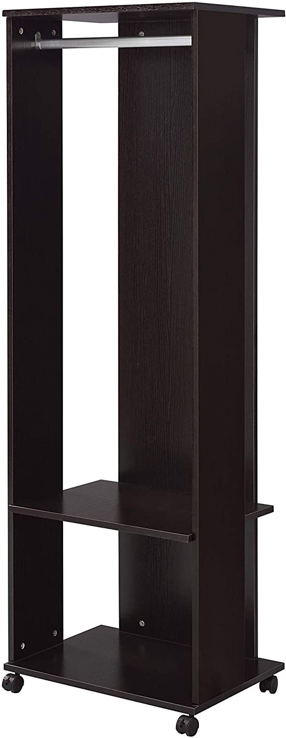 Product Details : Rectangular Hall Tree : Storage: 2 Open Compartment (Top with Hanging Rod) : Wooden Open Frame and Mirrored Back Panel : Base with Caster Wheels