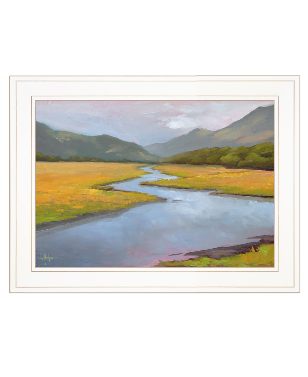 "La Historia De La Granja" artwork by William Hawkins. This decorative white framed 19"X15" wall art features a mountains with the river running through is such as restful location; making you want to get in our kayak and slowly go through the region. Our products are proudly made by skilled American workers. The surface of our framed art is textured with a fade resistant coating, so no glass is necessary. A vegetable-based glue is used in the production of our products, and our frames are crafted from 100% recycled material. In keeping with our environmentally friendly approach towards manufacturing. Arrives ready to hang Arrives ready to hang. Our products are proudly made by skilled American workers. The surface of our framed art is textured with a fade resistant coating, so no glass is necessary. A vegetable-based glue is used in the production of our products, and our frames are crafted from 100% recycled material. In keeping with our environmentally friendly approach towards manufacturing. Arrives ready to hang Arrives ready to hang. •Print has fade resistant surface texture, no glass is necessary•Woman Owned Business (WBE)•Arrives ready to hang, no additional hardware needed on item•individually hand crafted by skilled American workers•Cleaning Instructions: Clean with Soft Dry Cloth Only•Made in U.S.A.•Artwork by American Artist