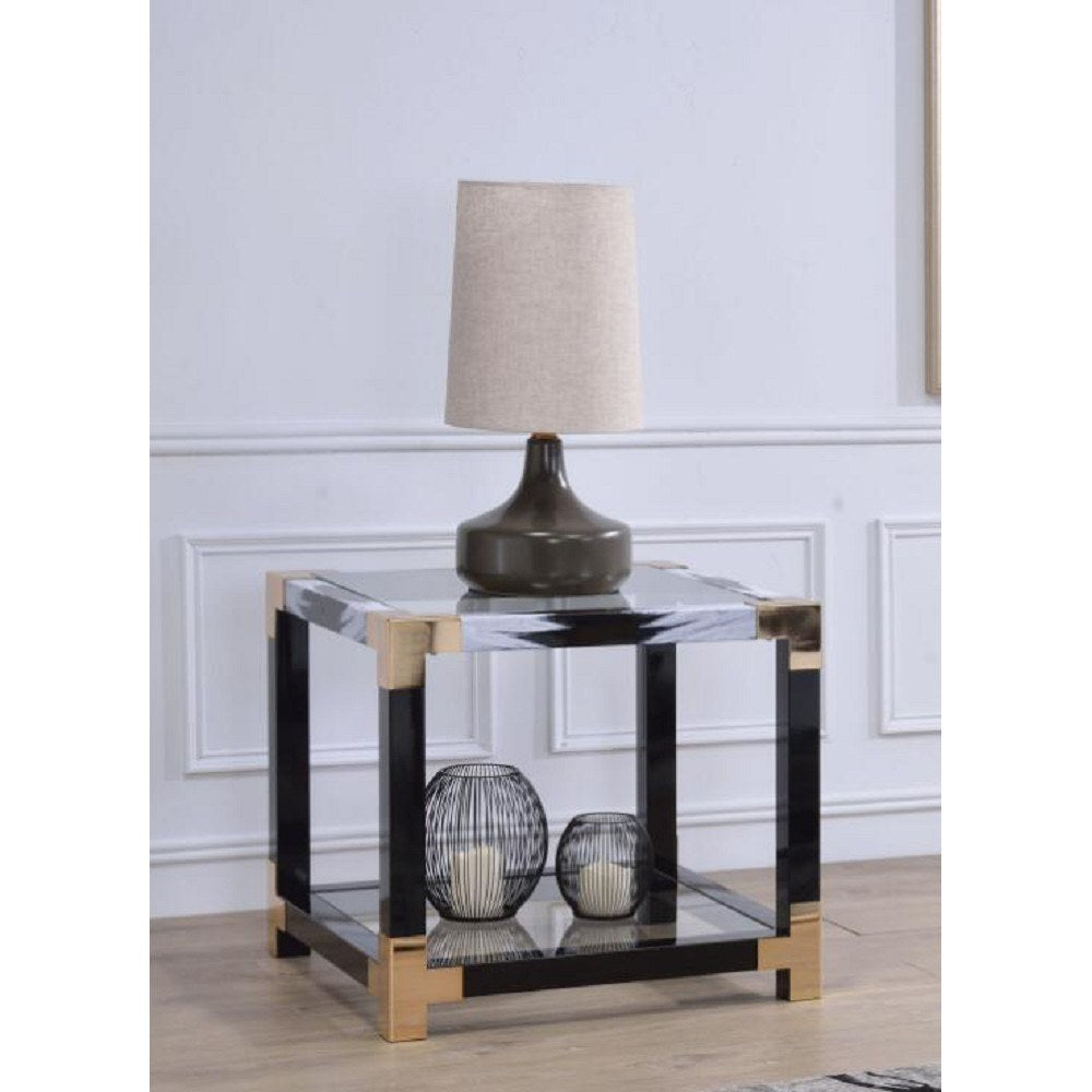 Product Details : KD; Square Leg End Table : Storage: Open Compartment (Bottom Glass Shelf) : Glass Top & Shelf: 5mm Clear Tempered Glass; NOT Beveled (Fixed Top/No Apron) : Metal Square Leg; Top Trim & Crossbar Support Frame: Hand Brushed White & Copper : Clearance between Floor & Base Support: 2 Inches Height