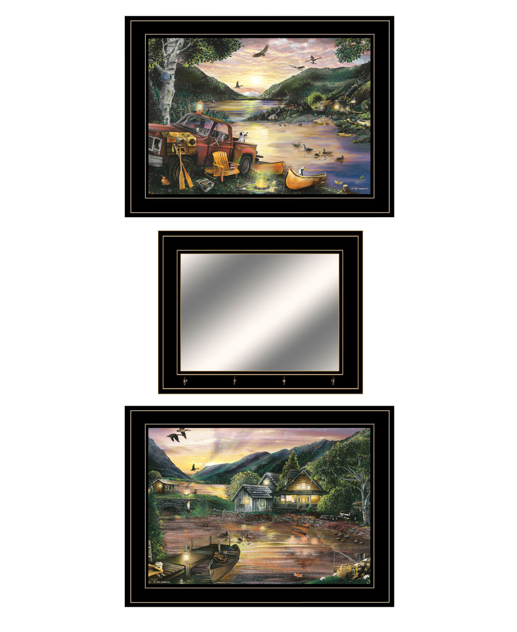 VED657-704GMH "Lakefront Camping" By Ed Wargo. Three Piece Cabin Collection features Handmade Decorative black (12x15) framed Mirror with four hooks by Trendy Decor 4U. Includes 2 black framed prints: "Lakefront Camping I" (19x15) and "Lakefront Camping II" (19x15). The surface of the art is coated with a fade resistant texture which gives it a canvas-like appearance. No glass is necessary. Arrives ready to hang. Made in USA.•Women Owned (WBE)•Textured Artwork with a 'rolled on' acid free acrylic coating to create a canvas painting effect. No glass is necessary.•UV protectant coating protects artwork from fading.•Molding adds natural beauty to the framed art. Frame is keyholed for ease of hanging.•Frame is keyholed for ease of hanging.