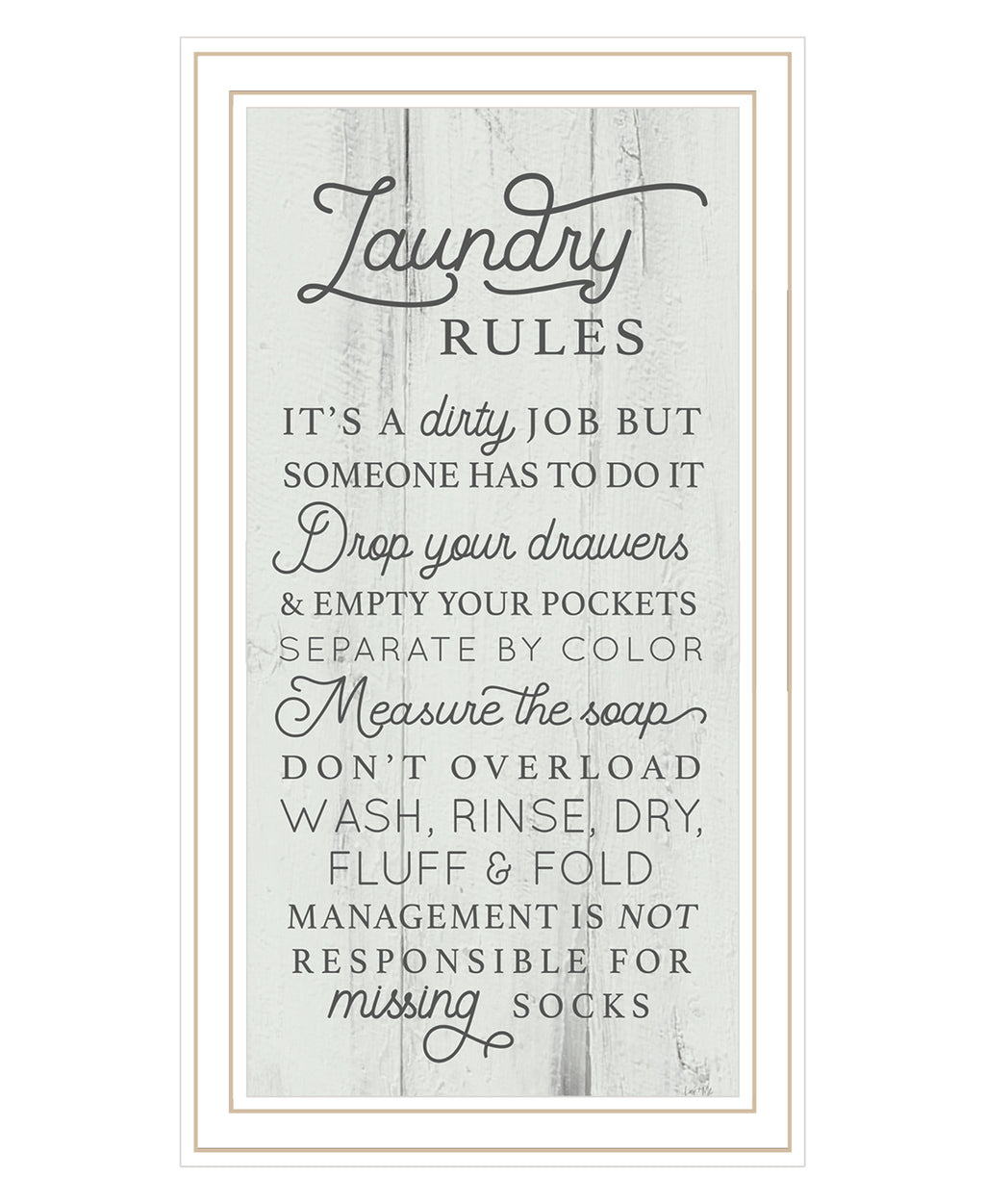 "Laundry Rules" is by Artisan Lux+ Me Designs. This 11"X20" decorative white rammed wall art. This image features a white faded background with the script reading "Laundry Rules it's a dirty job but someone has to do it Drop your drawers & empty your pockets separate by color measure the soap doesn't overload wash, rinse, dry fluff and fold management is not responsible for missing socks.". Our products are proudly made by skilled American workers. The surface of our framed art is textured with a fade resistant coating, so no glass is necessary. A vegetable-based glue is used in the production of our products, and our frames are crafted from 100% recycled material. In keeping with our environmentally friendly approach towards manufacturing. Arrives ready to hang.•Print has fade resistant surface texture, no glass is necessary•Woman Owned Business (WBE)•Arrives ready to hang, no additional hardware needed on item•individually hand crafted by skilled American workers•Cleaning Instructions: Clean with Soft Dry Cloth Only•Made in U.S.A.•Artwork by American Artist