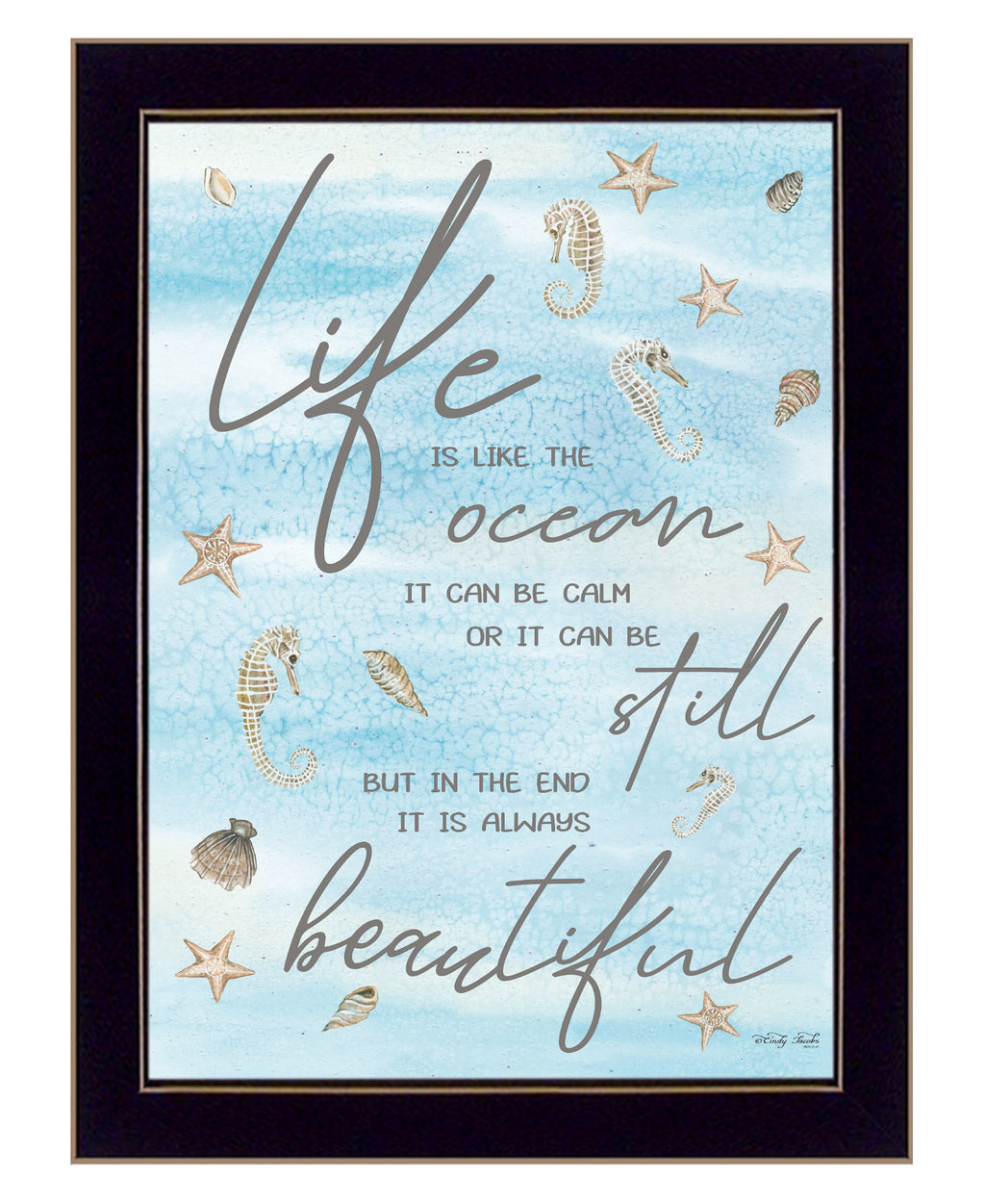"Life is Like" is by Artisan Cindy Jacobs this 14"X18" black framed wall art features a beautiful arrangement of different sea life a top of a blue background the script reads "Life is like the ocean it can be calm, or it can be still but, in the end, it is always beautiful.". Our products are proudly made by skilled American workers. The surface of our framed art is textured with a fade resistant coating, so no glass is necessary. A vegetable-based glue is used in the production of our products, and our frames are crafted from 100% recycled material. In keeping with our environmentally friendly approach towards manufacturing. Arrives ready to hang •Print has fade resistant surface texture, no glass is necessary•Woman Owned Business (WBE)•Arrives ready to hang, no additional hardware needed on item•individually hand crafted by skilled American workers•Cleaning Instructions: Clean with Soft Dry Cloth Only•Made in U.S.A.•Artwork by American Artist