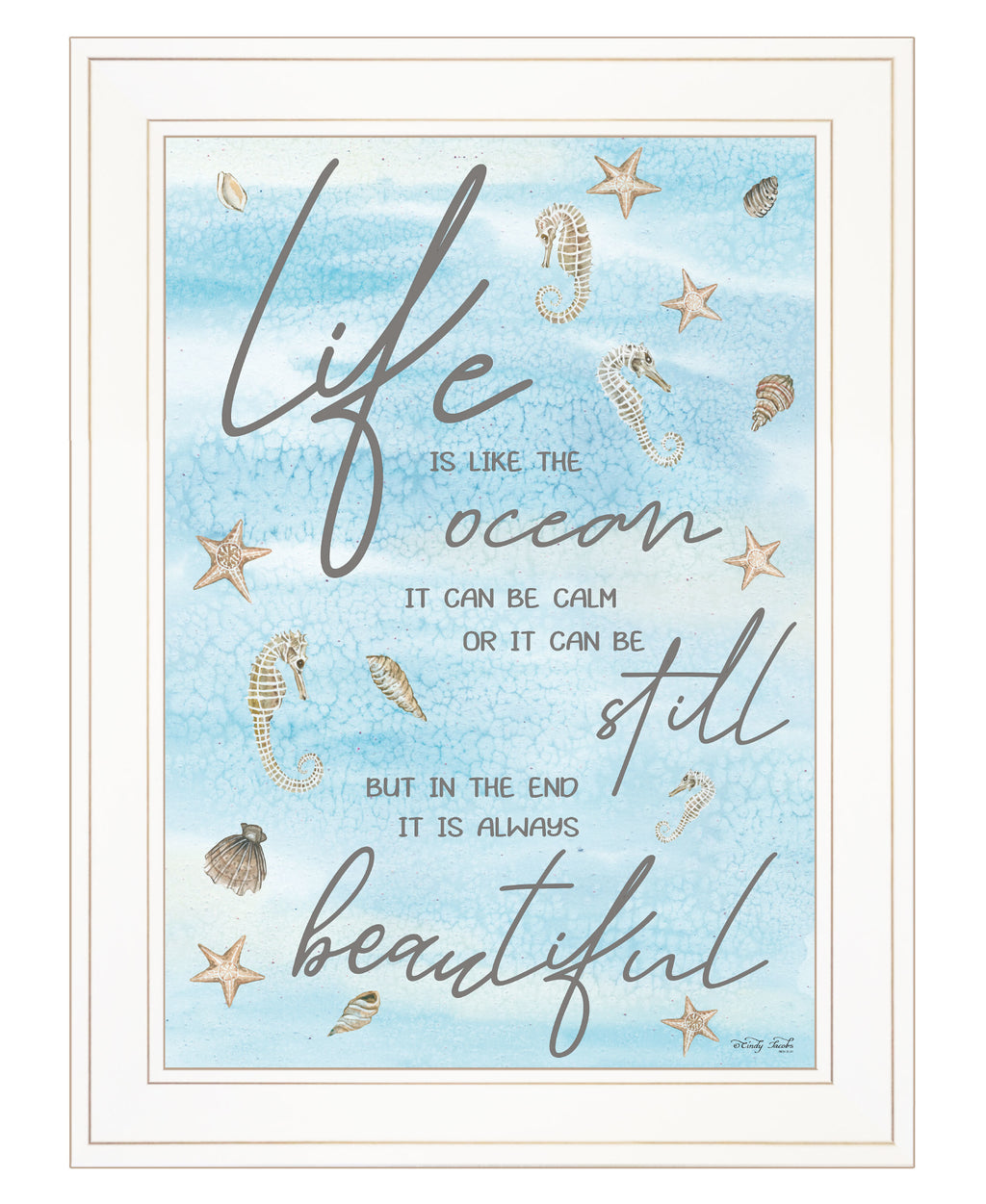 "Life is Like" is by Artisan Cindy Jacobs this 15"X19" white framed wall art features a beautiful arrangement of different sea life a top of a blue background the script reads "Life is like the ocean it can be calm, or it can be still but, in the end, it is always beautiful.". Our products are proudly made by skilled American workers. The surface of our framed art is textured with a fade resistant coating, so no glass is necessary. A vegetable-based glue is used in the production of our products, and our frames are crafted from 100% recycled material. In keeping with our environmentally friendly approach towards manufacturing. Arrives ready to hang •Print has fade resistant surface texture, no glass is necessary•Woman Owned Business (WBE)•Arrives ready to hang, no additional hardware needed on item•individually hand crafted by skilled American workers•Cleaning Instructions: Clean with Soft Dry Cloth Only•Made in U.S.A.•Artwork by American Artist