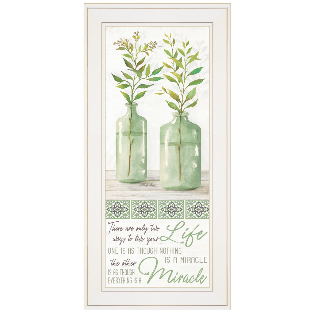 "Live Your Life" is a 11"x27" frmaed print by artist Cindy Jacobs. This decorative white framed print of Glass Jars, Plants, Life, and a script of Miracles. Prints are UV coated (glass is not needed) and arrives ready to hang.•TEXTURED ARTWORK with a 'rolled on' acid-free acrylic coating to create a canvas painting effect.•UV PROTECTANT COATING protects artwork from fading. No glass is necessary.• MOULDING adds natural beauty to the framed art. Frame is keyholed for the easy hanging.•THIS FINE HOME DECOR piece made in the USA by Woman Owned Business (WBE) is a perfect gift for a friend or relative.
