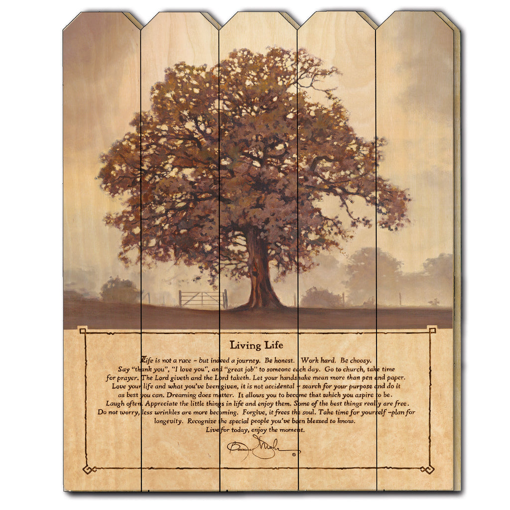 COW128P Living Life by artisan Bonnie Mohr. Art printed directly on a 16 x 20 wood picket fence, with Bonnie Mohr's famous advice for living life to the fullest. Arrives ready to hang. • ARTWORK is printed on a wooden fence.•Sawtooth hanger on the back makes this beautiful artwork ready to hang.•Baltic Birch grain pattern adds natural beauty to the framed art. Fence has sawtooth hanger for the ease of hanging.•THIS FINE HOME DECOR piece made in the USA by Woman Owned Business (WBE) is a perfect gift for a friend or relative.