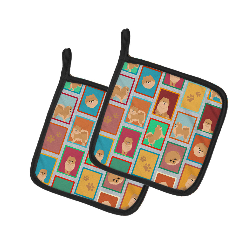 Pair of Pot Holders featuring breed specific Pomeranian artwork. A Pair of Pot Holders to match your kitchen decor. Made in the USA these are thick and functional. Full color artwork decorates the front polyester fabric of the hot pad and accented by a black trim. Use these at as a trivet for your Thanksgiving or Christmas tablescape. Filled with insulated fabric and quilted for durability. These colorful pot holders will make a great gift for your favorite home cook or executive chef. Each pot holder measures approximately 7 1/2 inches by 7 1/2 inches. A hanging tab is included.