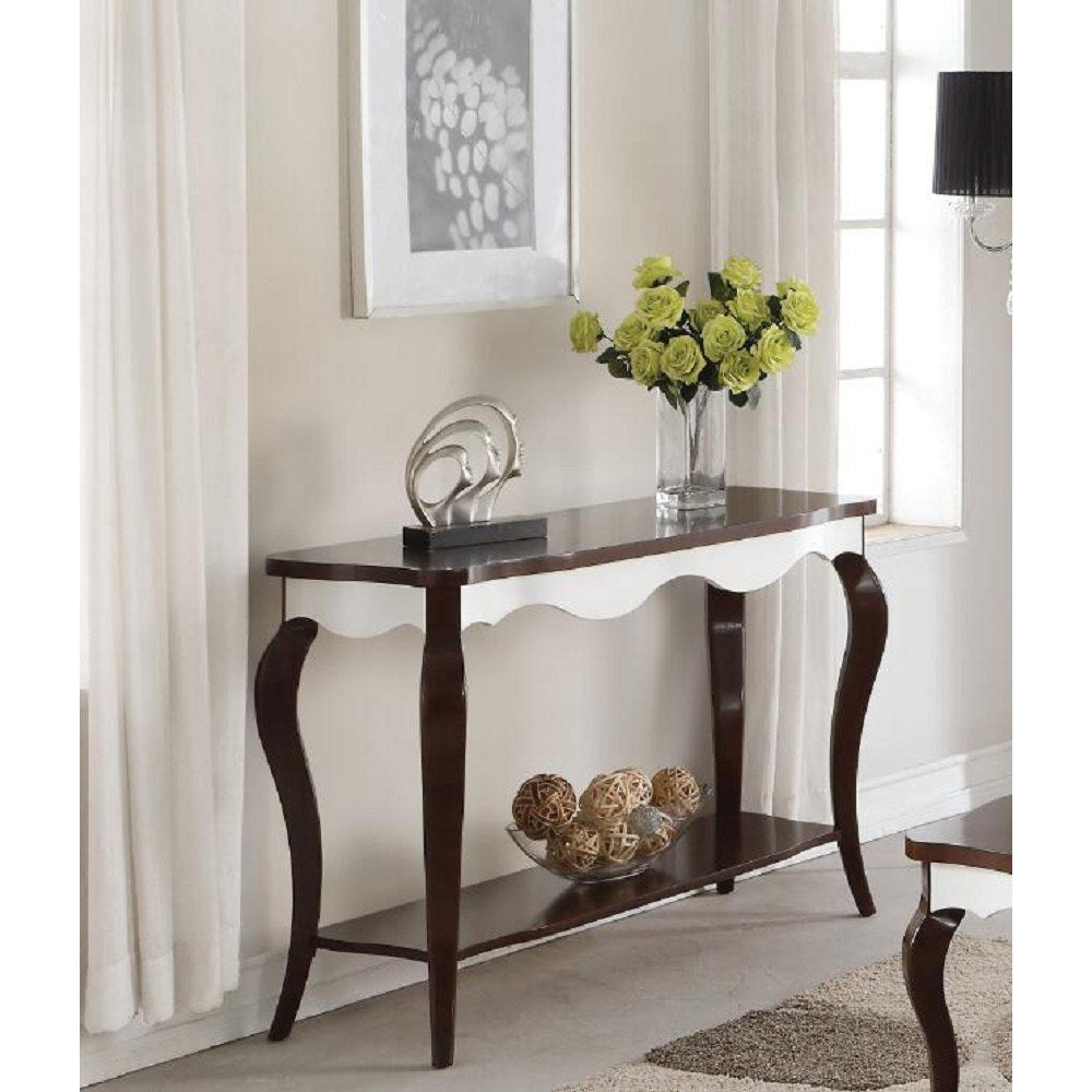 Product Details : KD; Rectangular Leg Sofa Table : NO Storage (Open Base) :: CONSTRUCTION :: Wood Top & Scrolled Apron: Walnut Top & White Apron (Fixed Top) : Wood Cabriole Leg: Walnut Finish :