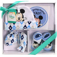 Celebrate a beautiful new baby with Mickey Mouse! Includes hat, socks, gloves and sticker.