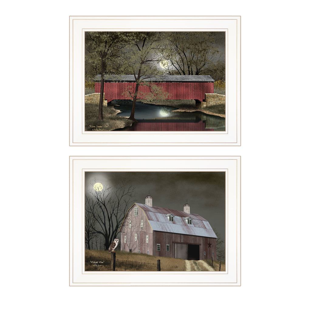 V272-226G - "Midnight Moon" by artisan Billy Jacobs. This is a vignette of 2-15x19 White framed prints. Life-like images of a bridge over a river and a big old barn at midnight. Beautiful prints of a red covered wooden bridge and a faded red barn in the countryside - both set in midnight, cloudy settings offers a unique view of the country at night. This totally American Made wall decor item features an decorative white frame. The framed art print has a protective, archival finish (glass is not needed) and arrives ready to hang.•Textured Artwork with a 'rolled on' acid free acrylic coating to create a canvas painting effect. No glass is necessary.•Surface of the print has a fade resistant coating.•Arrives Ready to Hang•Woman Owned Business (WBE)•Handmade in the USA•Decorative Moulding adds natural beauty to the framed art.