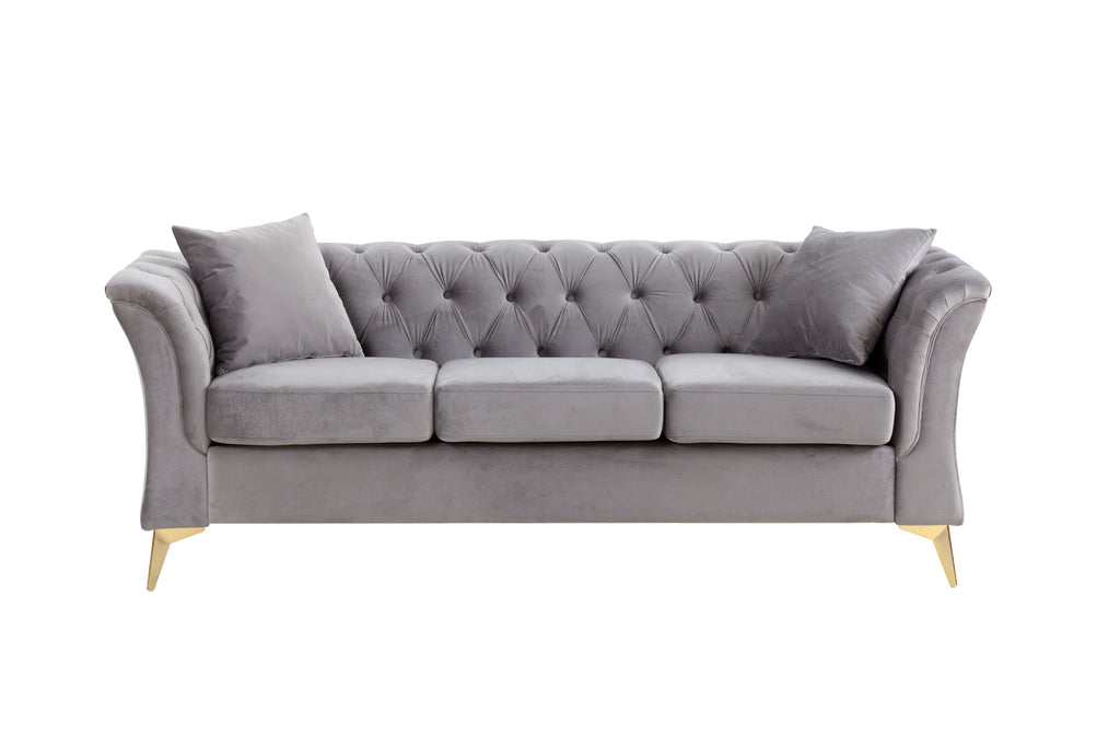 Modern Chesterfield Curved Sofa Tufted Velvet Couch 3 Seat Button Tufed Couch with Scroll Arms greyThe sofa designed by modern chesterfield style, The 3-seater sofa matches any decorative theme perfectly, and is a great addition to your living room, bedroom or office.Modern sofas are made of a solid wood frame, and strong metal legs can provide 750 pounds of stable support, This comfortable sofa is made of soft velvet fabric, built-in high-density foam and pocket springs to give you the greatest comfort.The size of our sofa including all parts and clear instructions. Each part has a label. You can install the sofa according to the instructions. Soon you will be comfortable 3 Seat sofa