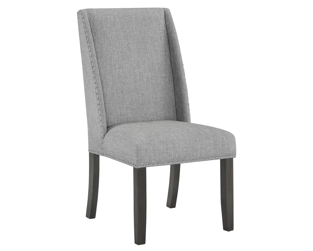 Description :- This upholstered side chair is a stunning addition to any dining room or living space. Its black finish gives it a sleek, modern look that perfectly accents the neutral grey upholstery. The chair is upholstered with a soft, breathable fabric to keep you comfortable while you sit, while the nailhead trim adds an elegant, decorative touch that's sure to impress. Perfect for both formal and casual settings, this chair will quickly become a favorite for family and guests alike.