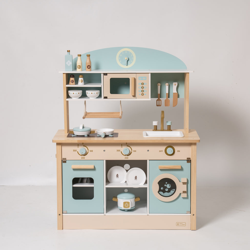 It is crafted from high quality MDF and solid wood. Sturdy and durable, there are many functional areas in the kitchen, which can meet the functions of playing, storage and so on.