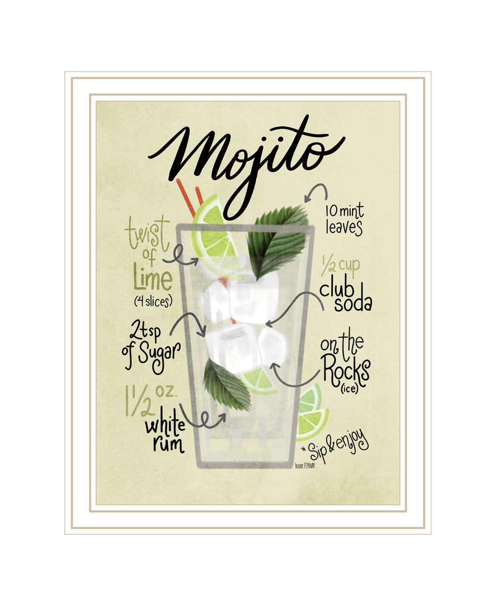 "Mojito" is by Artisan House Fenway. This 14"X18" decorative white framed wall art. A delightful framed print of the recipe for the drink in a fanciful script. Our products are proudly made by skilled American workers. The surface of our framed art is textured with a fade resistant coating, so no glass is necessary. A vegetable-based glue is used in the production of our products, and our frames are crafted from 100% recycled material. In keeping with our environmentally friendly approach towards manufacturing. Arrives ready to hang.•Print has fade resistant surface texture, no glass is necessary•Woman Owned Business (WBE)•Arrives ready to hang, no additional hardware needed on item•individually hand crafted by skilled American workers•Cleaning Instructions: Clean with Soft Dry Cloth Only•Made in U.S.A.•Artwork by American Artist