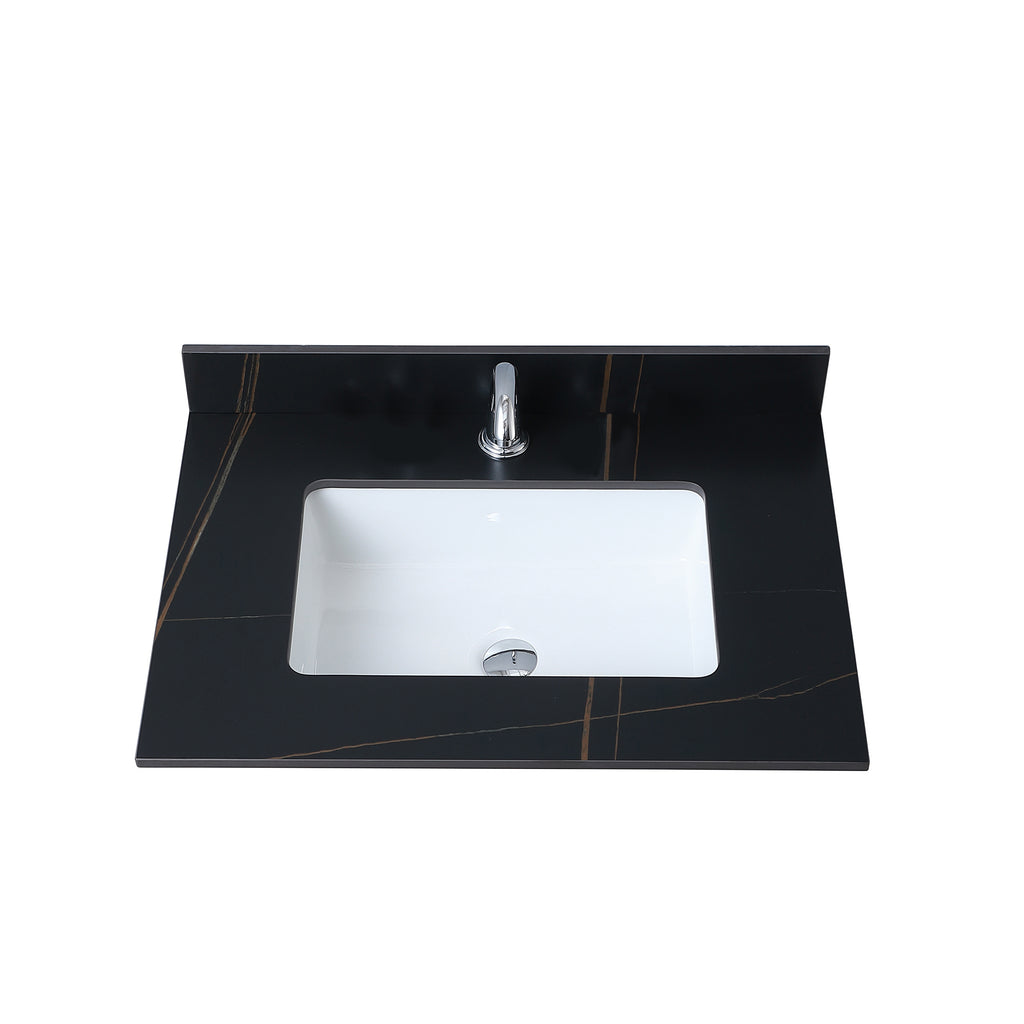 The vanity tops are made of beautiful sintered stone. All exterior sides are polished for a luxurious look. Each model is complemented with a ceramic Rectangle undermount sink. The matching backsplash is included in each package.