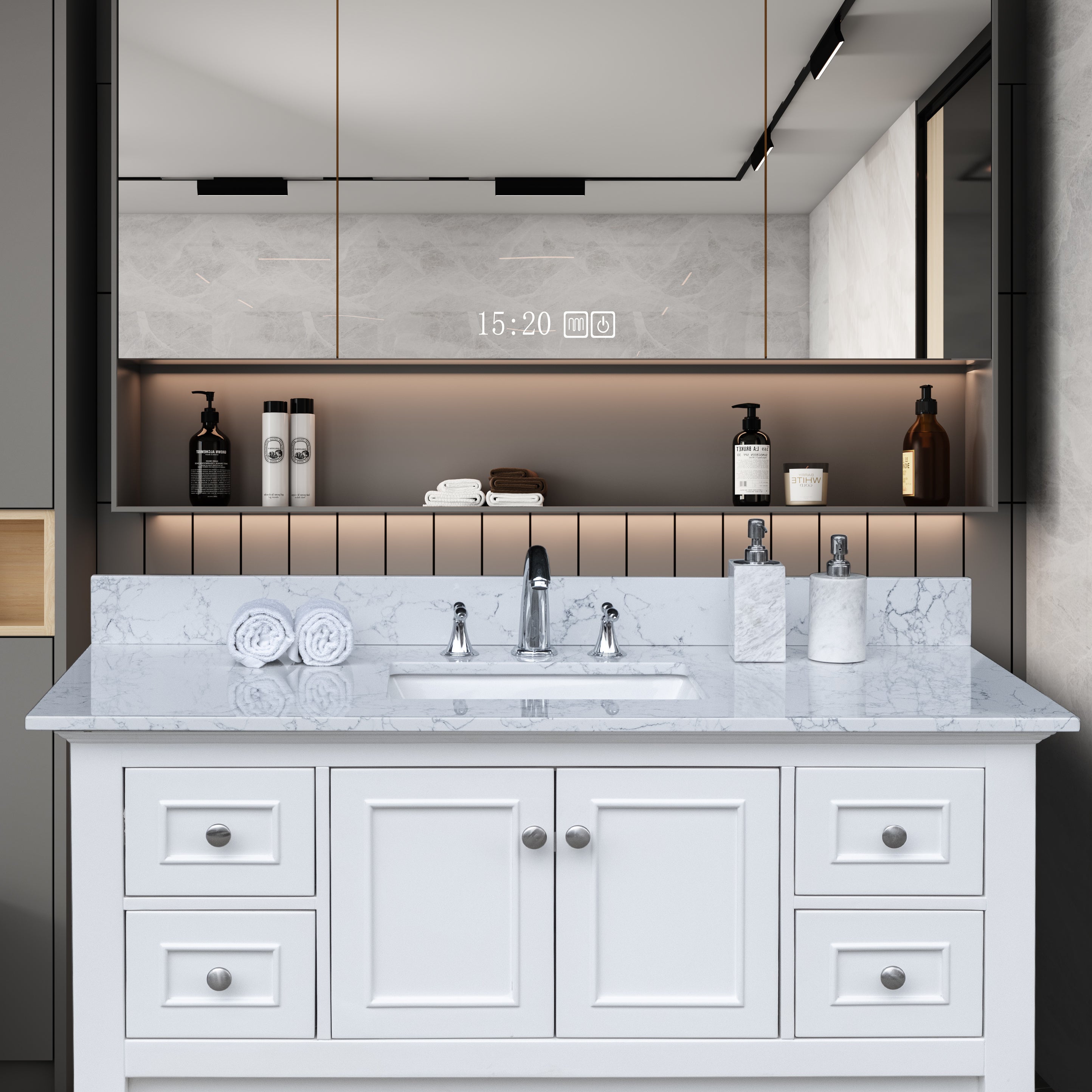 [Elegant & Stylish Top] Warmly elegant and stylish Carrara marble vanity top complement most Bathroom designs and coordinate with both light and dark cabinetry High-end and classic natural stone top Pre-sealed and Polished for added protection