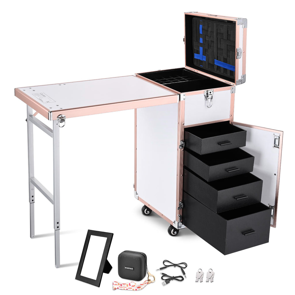- Mobile Makeup Studio - Features expandable floor-standing table for turning into a makeup workstation even outdoors; Fold it back as a one-piece trolley with 4 pcs 360-degree rotated & detachable wheels (including 2 are lockable) for easy traveling to different places and replacing the wheels; Comes with an individual mirror for checking makeup conveniently