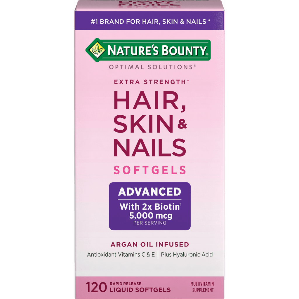 WITH BEAUTY-SUPPORTING BIOTIN.* Nature's Bounty Extra Strength Hair; Skin & Nails Rapid Release Softgels are easy to swallow and contain 5000 mcg of biotin; a vital nutrient that helps to maintain healthy hair while supporting overall beauty*
