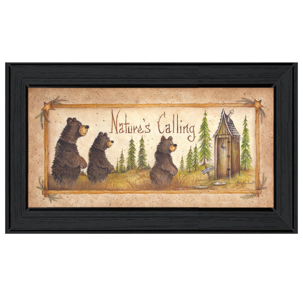 MARY291-405 Nature's Calling, by artisan Mary Ann June. This decorative black framed print (11x19) is one of the top sellers. 3 bears in line for the Outhouse. A wilderness setting, a outhouse with a half moon, and a lot of laughs. This totally American Made wall decor item features an decorative rustic frame. The framed art print has a protective, archival finish (glass is not needed) and arrives ready to hang.•Textured Artwork with a 'rolled on' acid free acrylic coating to create a canvas painting effect. No glass is necessary.•Surface of the print has a fade resistant coating.•Arrives Ready to Hang•Woman Owned Business (WBE)•Handmade in the USA•Decorative Moulding adds natural beauty to the framed art.