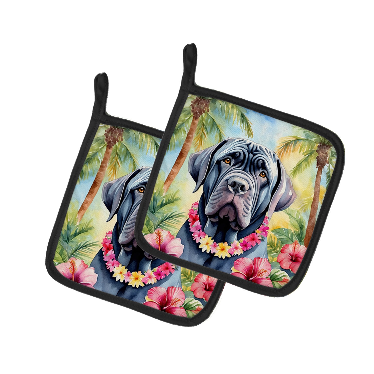Pair of Pot Holders featuring breed specific Neapolitan Mastiff artwork. A Pair of Pot Holders to match your kitchen decor. Made in the USA these are thick and functional. Full color artwork decorates the front polyester fabric of the hot pad and accented by a black trim. Use these at as a trivet for your Thanksgiving or Christmas tablescape. Filled with insulated fabric and quilted for durability. These colorful pot holders will make a great gift for your favorite home cook or executive chef. Each pot holder measures approximately 7 1/2 inches by 7 1/2 inches. A hanging tab is included.