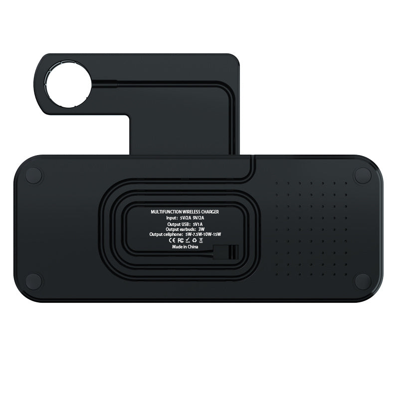 Note:The Apple Watch charger is not included. Product name: N51 Double 15W 4 in 1 wireless charger 1. Color black, white 2. Input 5V/2A 9V/2A 3. Wireless output 5W-7.5W-10W-15W 4. Headphone output 3W 5. USB output 5V1A 6. Material ABS 7. Induction distance 2-6mm 8. Working frequency 100-205KHz 9. Conversion efficiency 78% 10. Solution IC Haier Features: