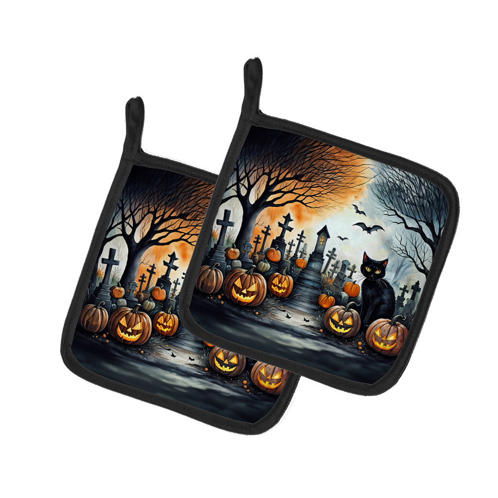 Celebrate Halloween with this Halloween Pair of Pot Holders. A Pair of Pot Holders to match your kitchen decor. Made in the USA these are thick and functional. Full color artwork decorates the front polyester fabric of the hot pad and accented by a black trim. Use these at as a trivet for your Thanksgiving or Christmas tablescape. Filled with insulated fabric and quilted for durability. These colorful pot holders will make a great gift for your favorite home cook or executive chef. Each pot holder measures approximately 7 1/2 inches by 7 1/2 inches. A hanging tab is included.