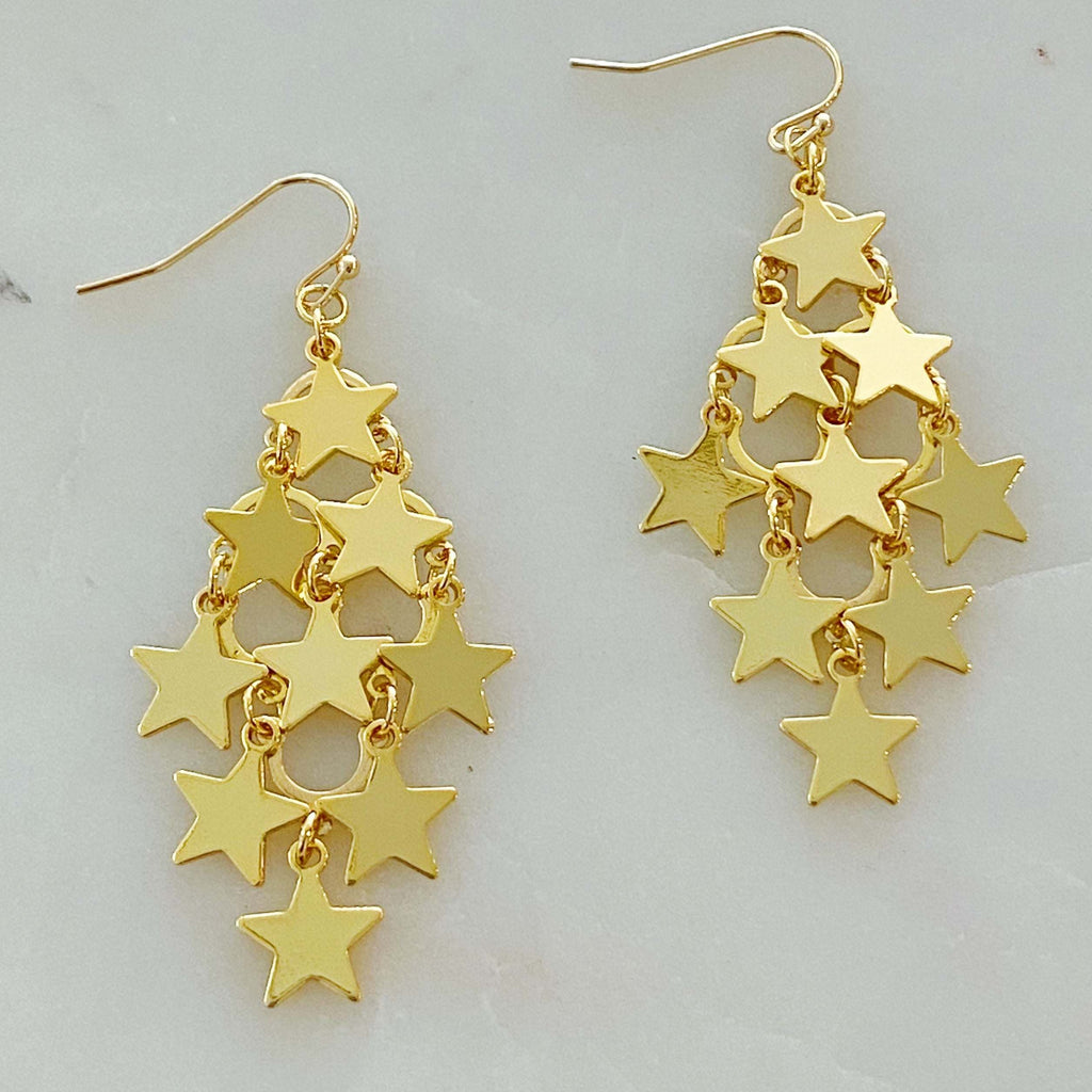 Elevate your style with our Nine Stars Lined Chandelier Earrings. The golden stars add a touch of sophistication while the delicate draping adds a subtle and elegant touch. Perfect for any occasion, these earrings are a must-have for everyday wear.