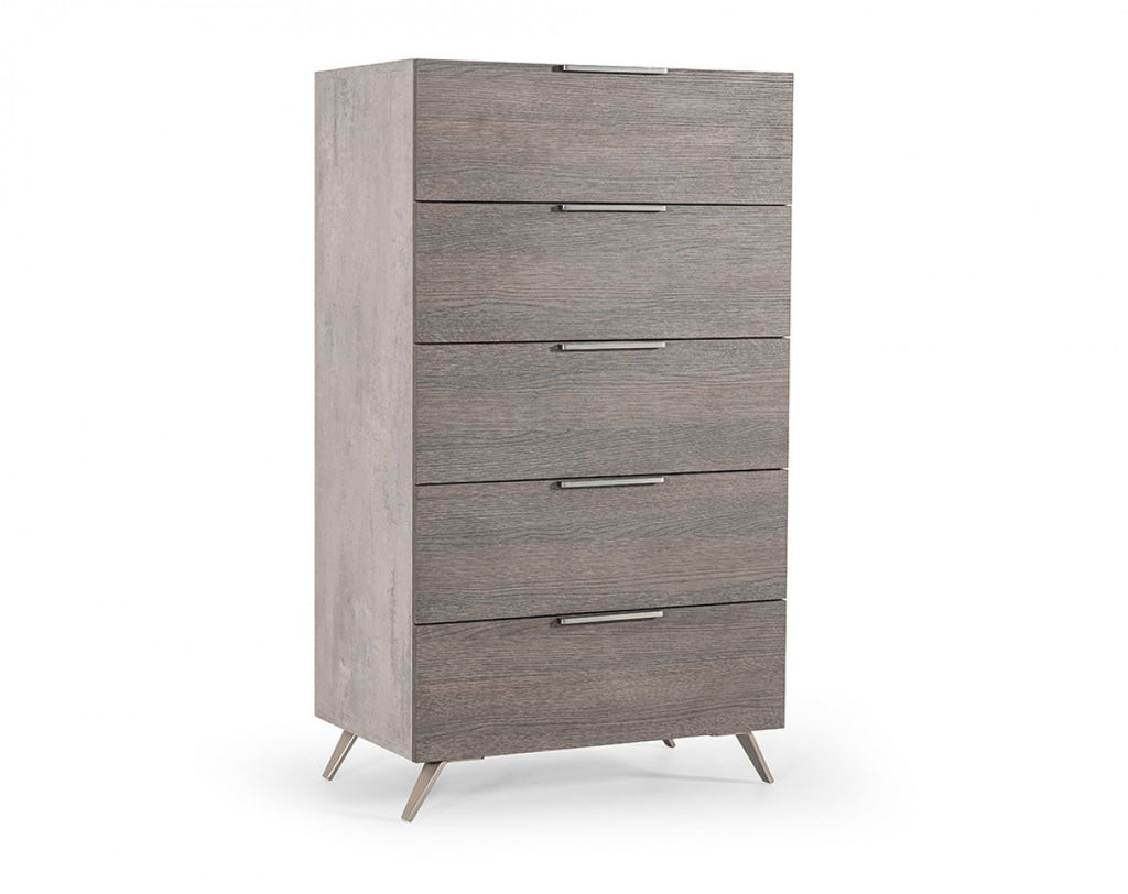 Want to get a classic modern style using the latest in fashionable furniture materials? Look no further than the Italian-made Bronx Chest. It's simple rectangular shape allows using a faux concrete laminate on the frame with a matte grey finished laminate for the five soft-closing drawers. A little metal contrast is achieved with brushed stainless steel pulls on each drawer and angled feet below. A great match for other Bronx series items. Some assembly is required.Features:Matte Grey & Faux Concrete Laminate. 5 Soft-Closing Drawers. Stainless Steel Handles & Legs. Assembly Required. Made In Italy. Dimensions:Overall: W31" x D19" x H54"Drawer: W30.9" x D15.75" x H5.1"